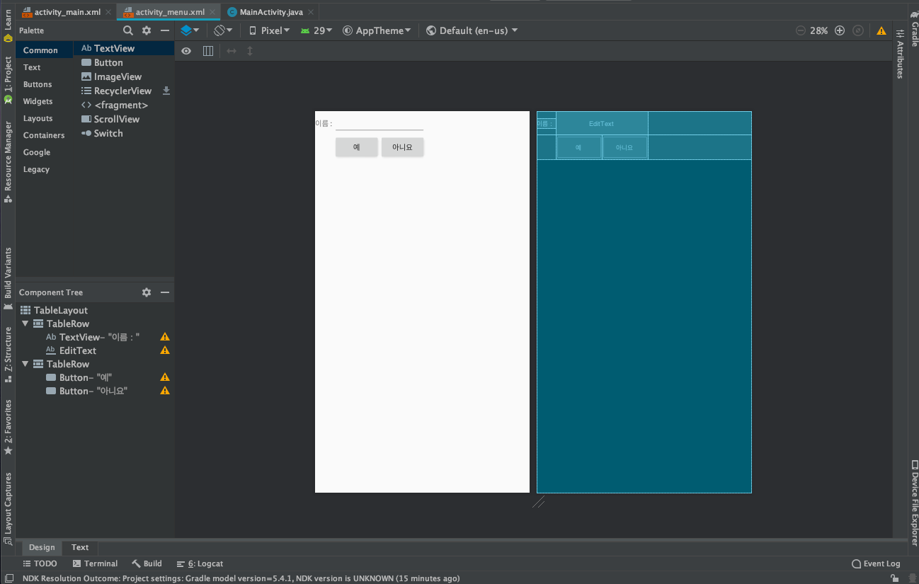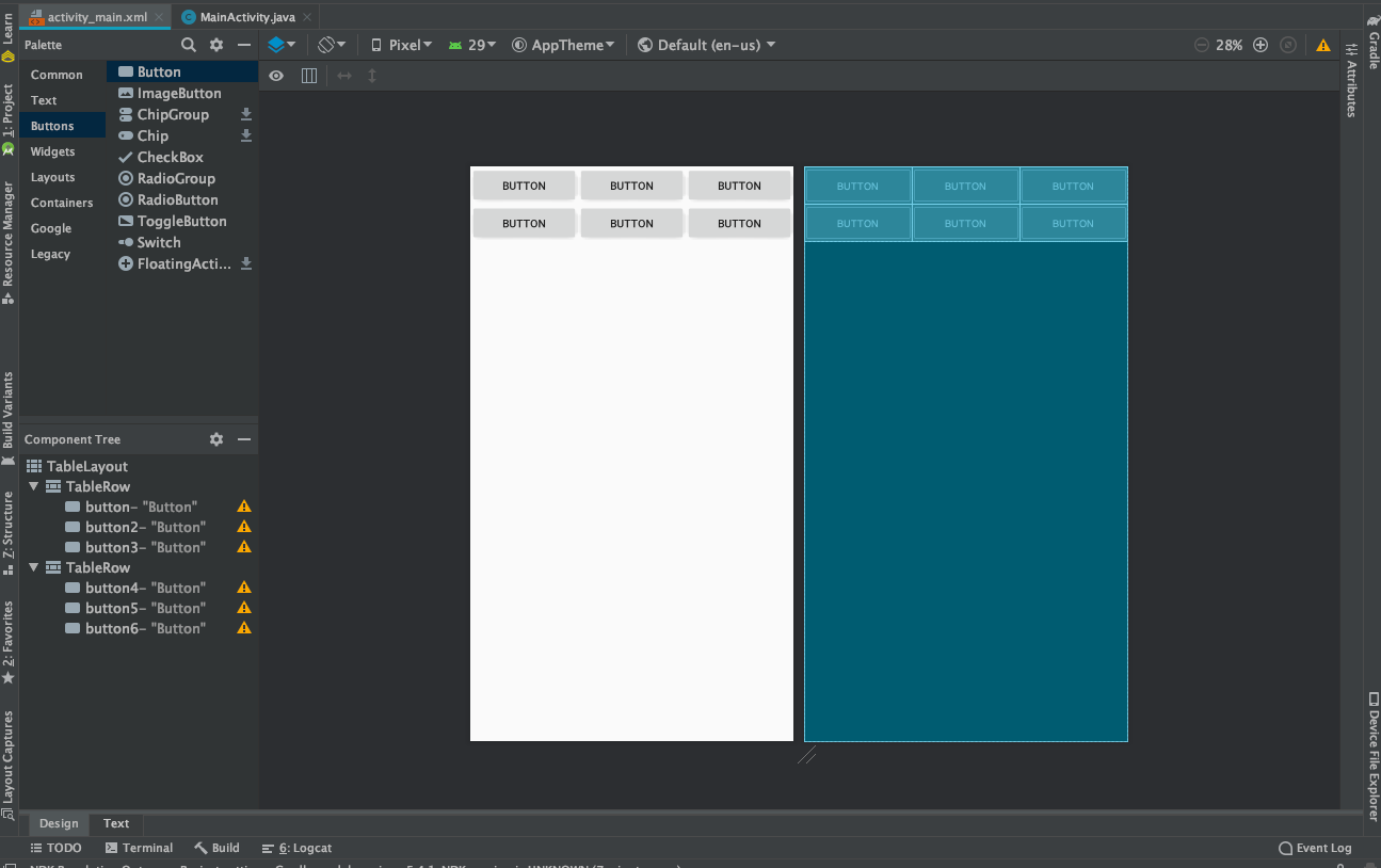 리니어 레이아웃 안에 리니어 레이아웃을 넣는 방식을 사용해도 격자 모양을 만들 수 있지만 테이블 레이아웃을 사용하면 좀 더 쉽게 만들 수 있습니다.