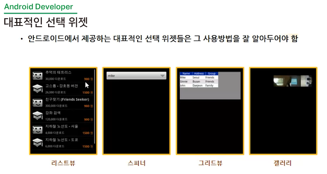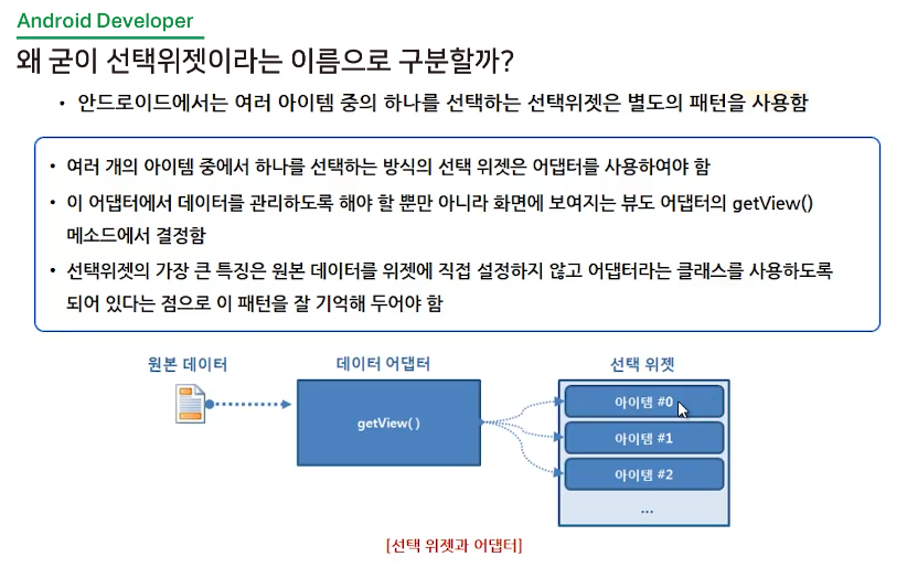 - 데이터 관리 역할을 하는 어댑터 클래스를 만들고, 그 안에 각 아이템으로 표시할 뷰를 리턴하는 getView() 메소드를 정의