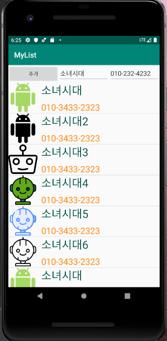 adapter.addItem(new SingerItem("소녀시대6", "010-3433-2323", R.drawable.android6));