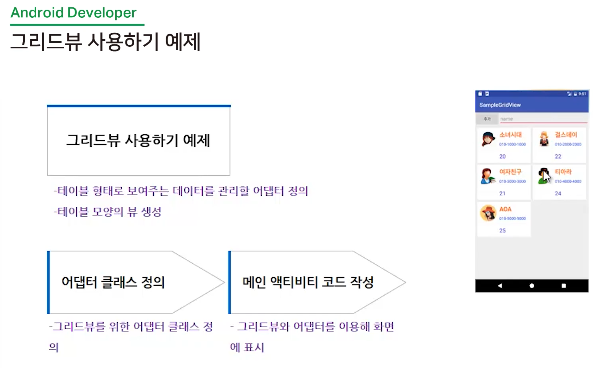 그리드뷰도 모두 여러 개의 아이템 중에서 하나를 선택하므로 어댑터라는 것을 사용하도록 만들어져 있습니다.