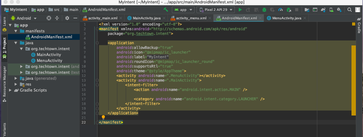 (2) app > manifest > AndroidManifest.xml에 MenuActivity가 추가 되어 있음