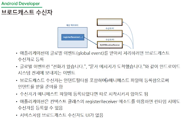 - 브로드캐스트 수신자 : 앱에서 SMS 메시지를 받고 싶다면 브로드캐스트 수신자를 만들어서 등록