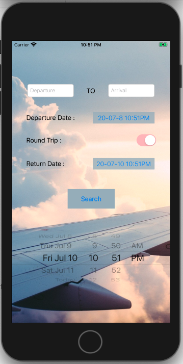 - Departure Date 버튼 클릭 하면 Picker View 보이도록 : showDatePickerAction